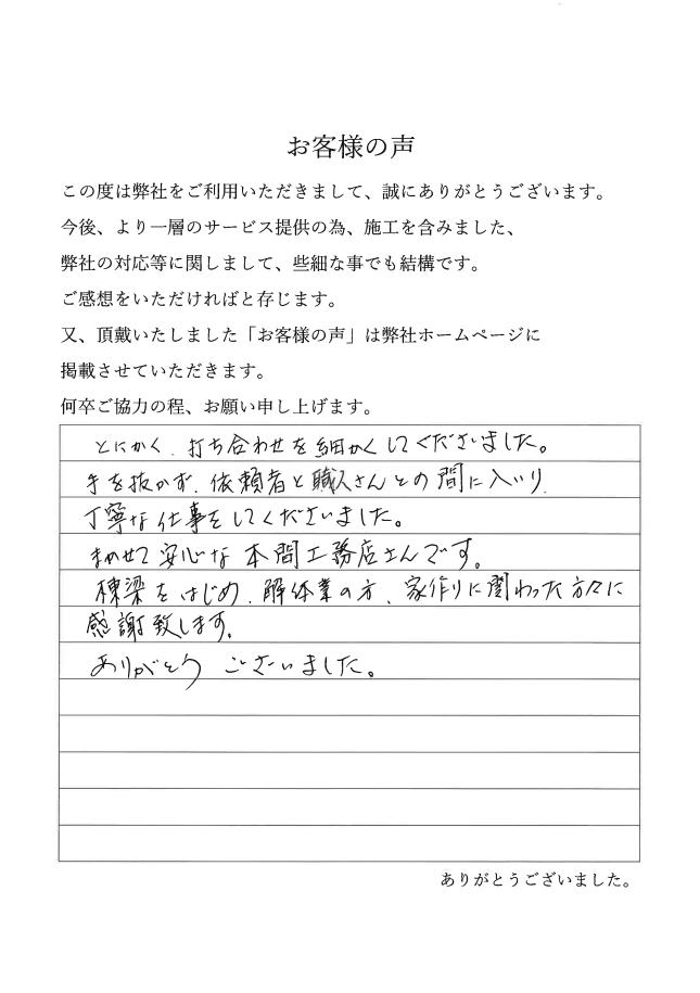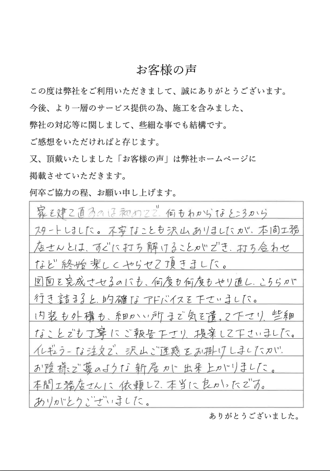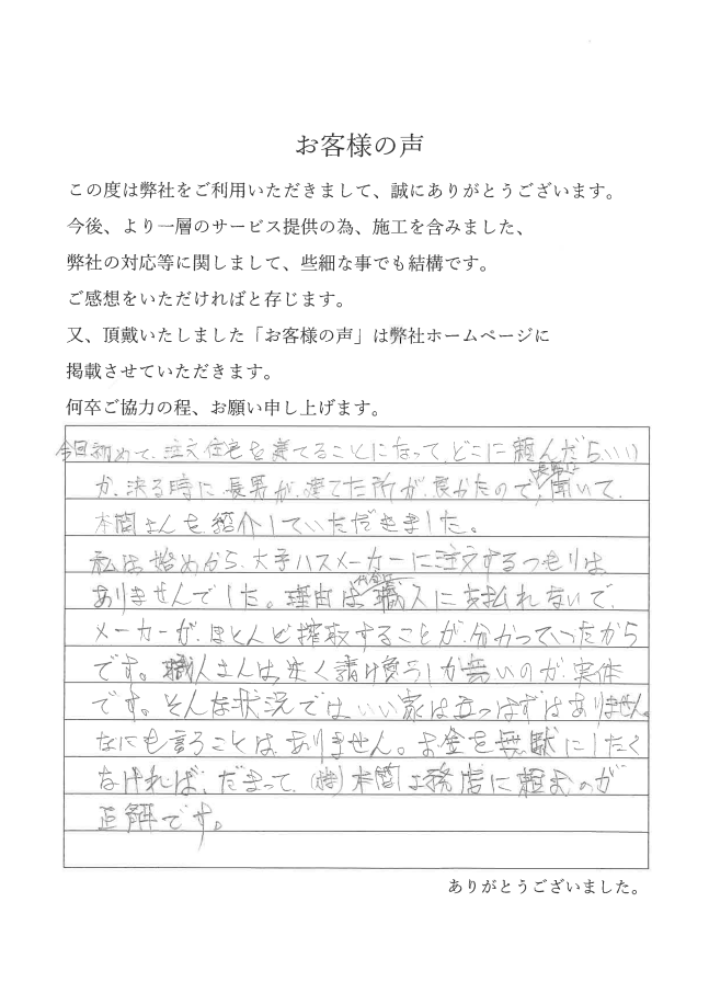 今回初めて注文住宅を建てることになって、どこに頼んだらいいか決まる時に、長男が建てたところが良かったので、長男に聞いて本間さんを紹介していただきました。
